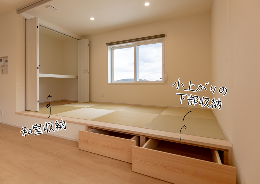 子育て世帯の方にに人気の畳スペース。親御様が宿泊される場合に備えて寝具を入れる物入を設置したり、小上がりの下部空間を引き出しにして無駄なく活用したり、利用用途に合わせて収納を設置しましょう!