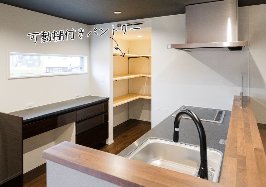 キッチン横の可動棚付きのパントリーは、キッチン周りをスッキリ片付ける家事の味方!パッと見て分かりやすく、さっと手軽に取り出せるので、料理がさらに楽しくなります♪棚の高さを調整できるので、収納アイテムのサイズや量に応じて柔軟に対応できるところも◎