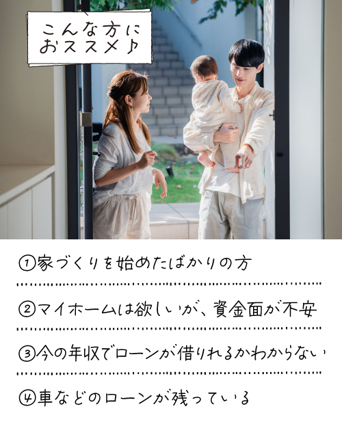 そんな方でも安心してお家づくりを進められるように、専門のスタッフがしっかりサポート!お客様にピッタリのプランで、無理なくお家づくりを進められる資金計画をご提案いたします♪
