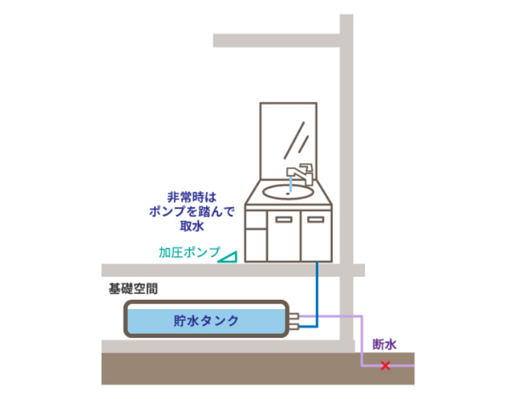 住居の基礎空間にタンクを設置。4人家族3日分に相当する最大36Lの水を蓄えることができます。家の水道を使用するだけで自動的にタンク内の水も新しく。非常時も普段の水道から水の取り出しが可能です。